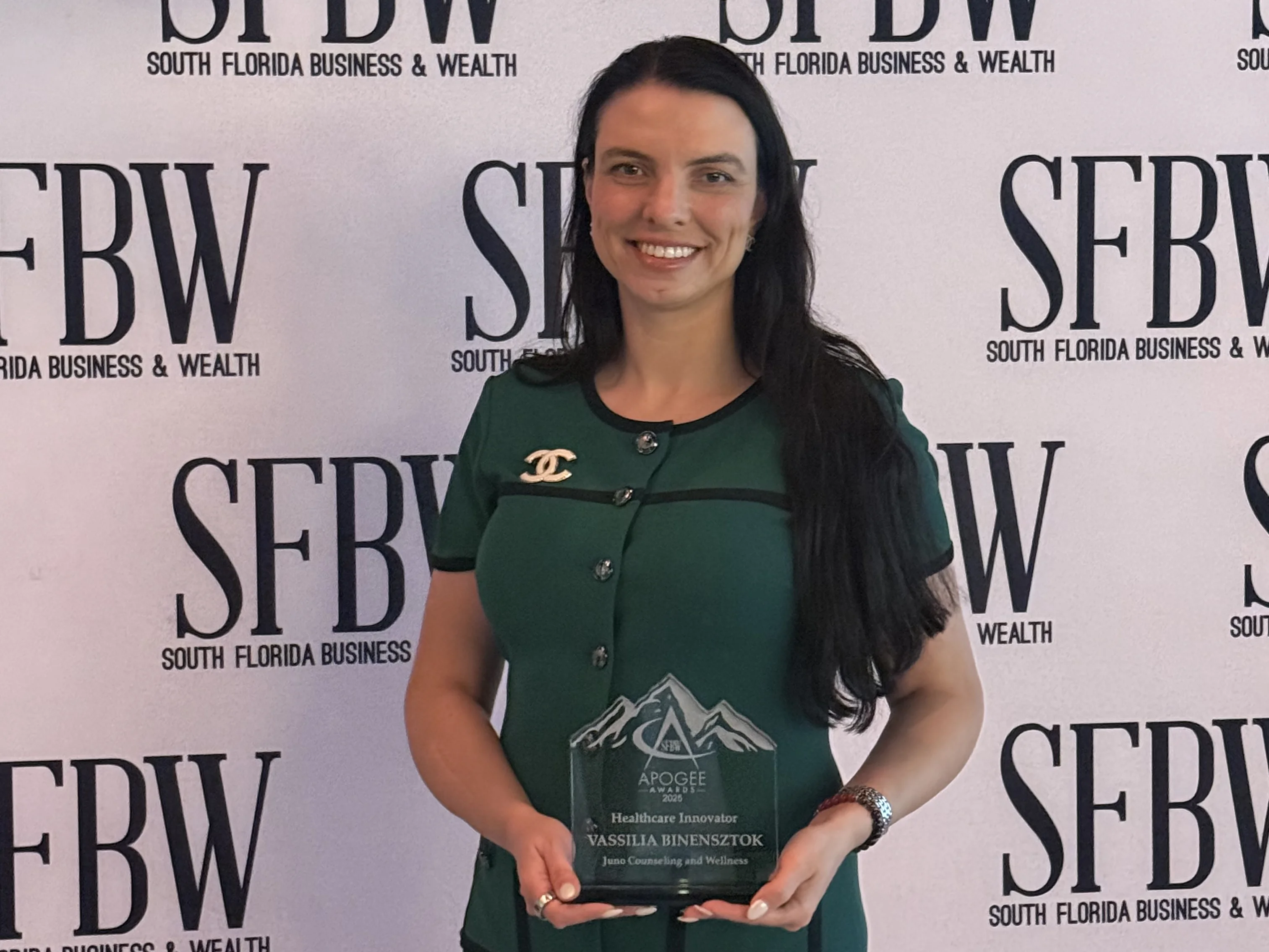 It is with great pride and excitement that Dr. Vassilia Binensztok, Founder and Lead Therapist of Juno Counseling & Wellness, announces her selection as the 2025 recipient of the Healthcare Innovator award in the prestigious Apogee Awards presented by South Florida Business & Wealth Magazine. The awards recognize distinguished C-Suite leaders across Miami-Dade, Broward, and Palm Beach counties whose dedication to their industries and communities rises to an apex of achievement.